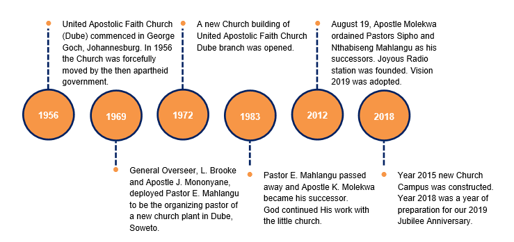 1983 March of 1983, Apostle Klaas Molekwa took over as the Senior Pastor of United Apostolic Faith Church Dube Branch after the passing away of Pastor EL Mahlangu. Apostle Molekwa previously served as a National Youth Chairperson of the United Apostolic Faith Church, South Africa before being called to pastor at UAFC Dube.